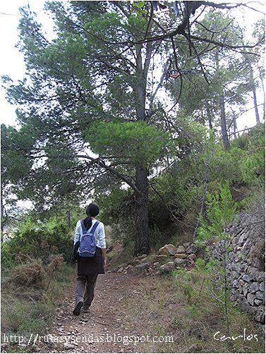 El sendero nos deja en una pista por la que continuamos descendiendo. Vemos una senda por la que continuamos el descenso, conectamos con otra senda que nos lleva hasta el fondo del pequeño barranco y después nos hace remontarlo. Seguimos siguiendo las marcas del PR hasta llegar a la Fuente de la Salud. Lo dejamos atrás para ir a subir por el sendero bonito entre pinos. Descendemos por la carretera y la cruzamos para dirigirnos hacía Montornes.